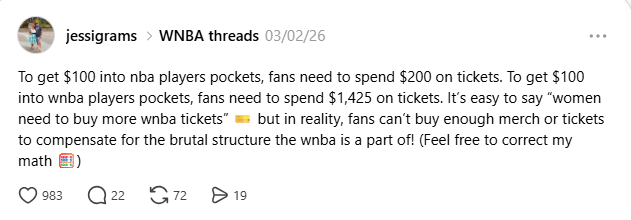 >The WNBA enters its landmark 30th season with WNBA Tip-Off 2026 on Friday, May 8>Details of a landmark WNBA collective bargaining agreement, per ESPN sources:>New salary cap starting at $7 million, up from $1.5 million>Average revenue share of nearly 20% across deal>Supermax starting at $1.4M>Average salary in range of $600K, minimum above $300KDespite all the negative press and even personal attacks directed at so many of them, they stuck to their goals and came to an agreement in the end. >Within a week of scoring 83 points, Bam Adebayo sees his girlfriend A’ja Wilson become the first WNBA player to receive a supermax under the new CBA. Four year deal starting at $1,400,000 per season to stay with the Aces previous thread: >>153634811