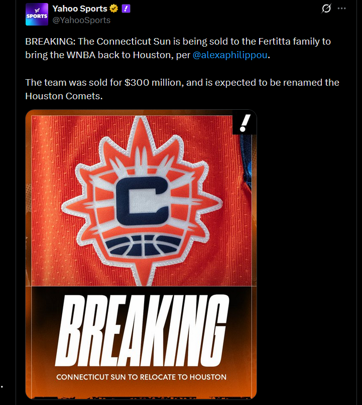 >>154021690It’s not good but the Sun owners are broke and the WNBA doesn’t want to deal with that headache when they are trying to make the league more of a serious, professional league. The Sun owners couldn’t afford to invest in improving facilities etc.>>154022807>>154022848>>154024471The boring reason is Houston is a huge market, they want a stable owner with deep pockets and there are advantages to sharing location and ownership with an NBA team. It’s OK to be pissed about it but it’s hardly a crazy decision.