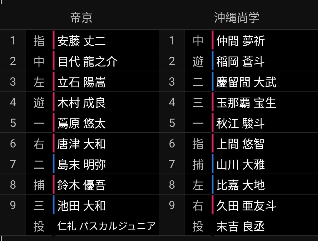LineupsTeikyo 1. DH Ando Joji 2. CF Medai Ryunosuke 3. LF Tateishi Hidaka 4. SS Kimura Sera 5. 1B Tsutahara Yuta 6. RF Karatsu Yamato 7. 2B Shimasue Meiya 8. C Suzuki Yugo 9. 3B Ikeda Yamato P. LHP Nirei Pascal Jr. (Yea it's name)Okinawa Shogaku 1. CF Nakama Ibuki 2. SS Inaoka Aoto 3. 2B Keruma Dan 4. 3B Tamanaha Hou 5. 1B Akie Hayato6. DH Uema Yuto 7. C Yamakawa Taiga 8. LF Higa Daichi 9. RF Kuda Ayuto P. LHP Sueyoshi Ryosuke