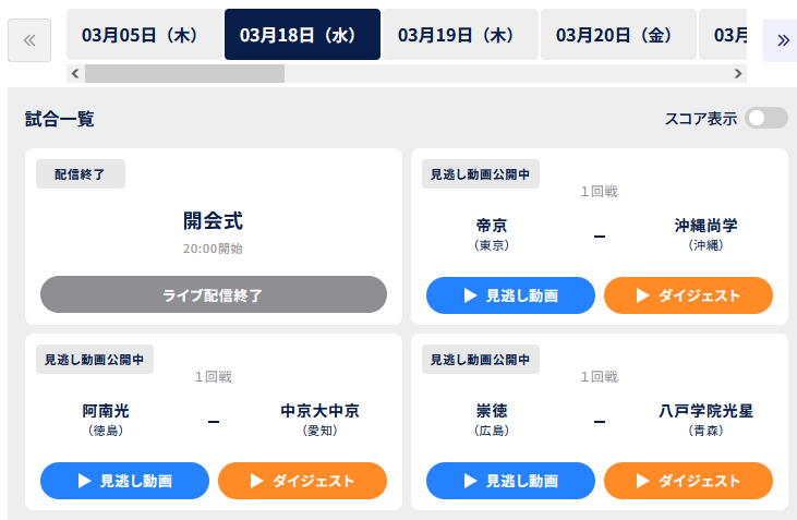 >>153927870all in japanese>>153928226the first game of the day starts at 8pm eastern time so you might be able to catch that one. there are full game replays on sportsbull https://sportsbull.jp/senbatsu/blue is the full game replay, orange are the highlights