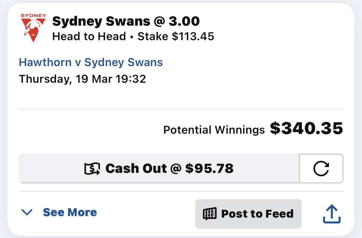 Swans are extremely vulnerable without their two prime movers in the midfield and I also think their handball heavy game won't hold up in finals and they'll just get pushed towards the boundary and have their movement locked down just like in the second half tonight.
