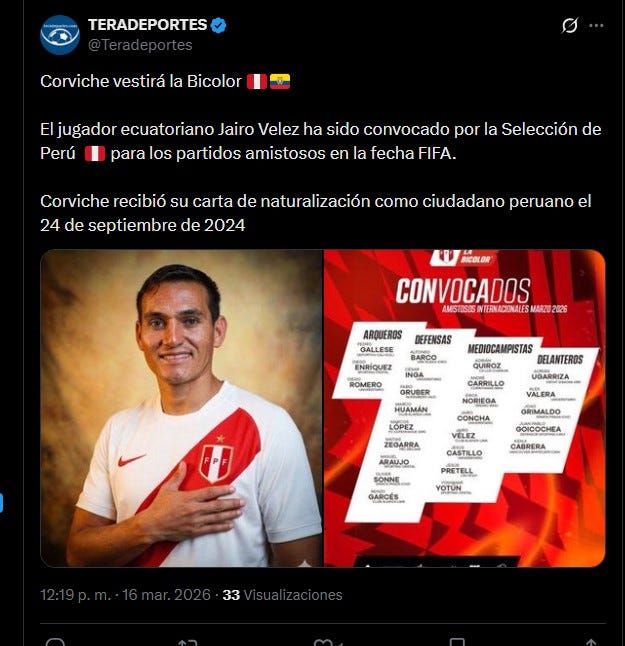 Peruvians (mano menezes) called up a naturalized ecuatorian player named jairo velez sarsfield