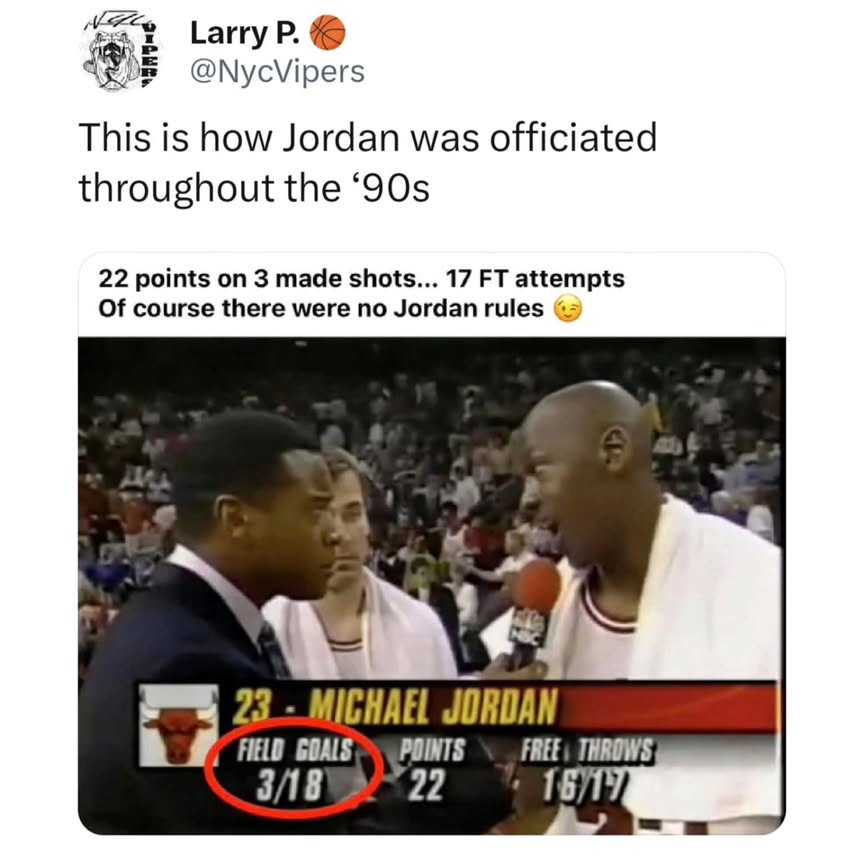 "Can't get too close to Michael; it's a foul" – Magic"I know that's Michael Jordan, but that's still a foul" – Charles Barkley"They want you to call traveling but not on jordan" – Phil Jackson to Tim Donaghy "You're not great until they change the rules to stop your dominance. They changed them so you couldn't stop Michael" – Wilt Chamberlain
