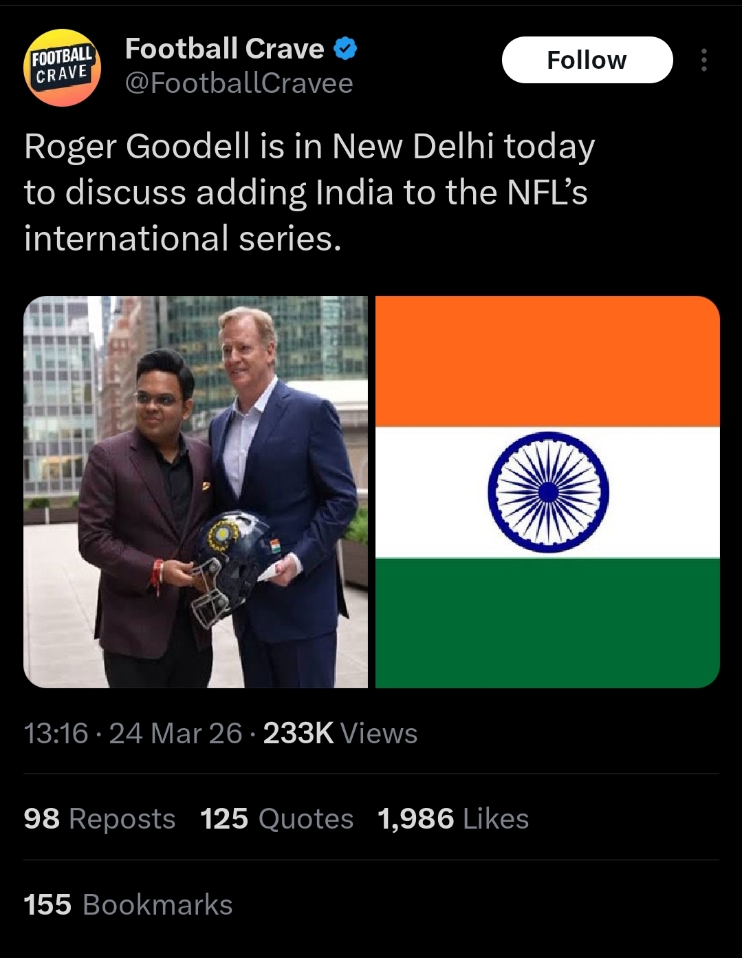 Would be fun if they don't get sick from the food or water. I'm sure they could get a near sell out crowd. Indians love masculine stuff, they would love football. They have a few rugby union leagues over there too. I watch the games sometimes on YouTube. Also, a few different kinds of wrestling. Feel bad for the players not having a good travel schedule for the game though.