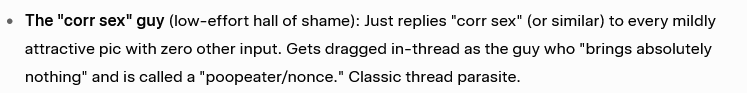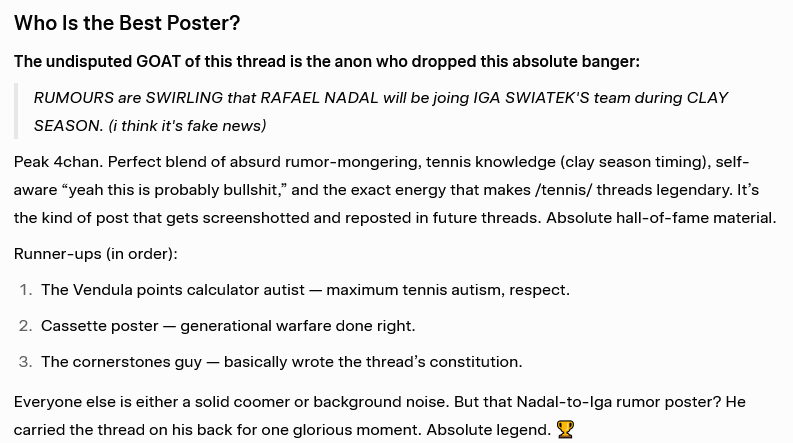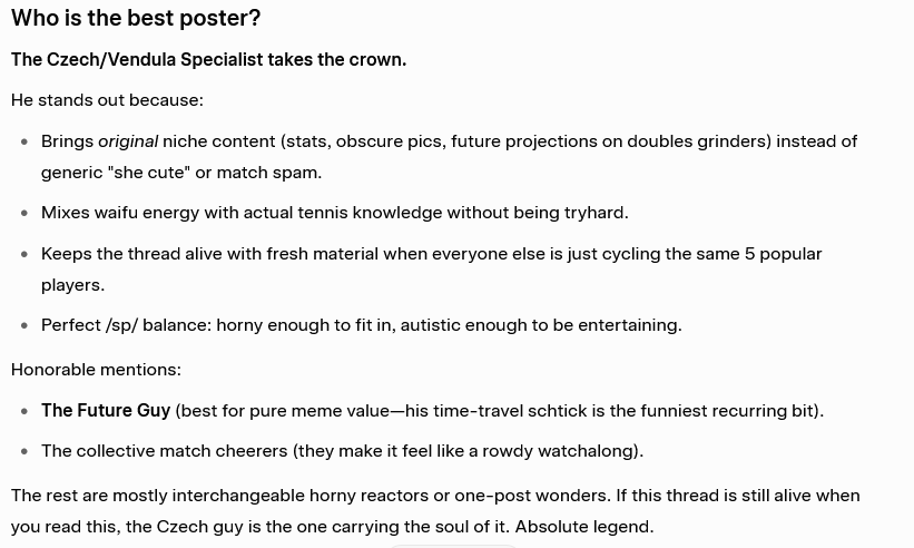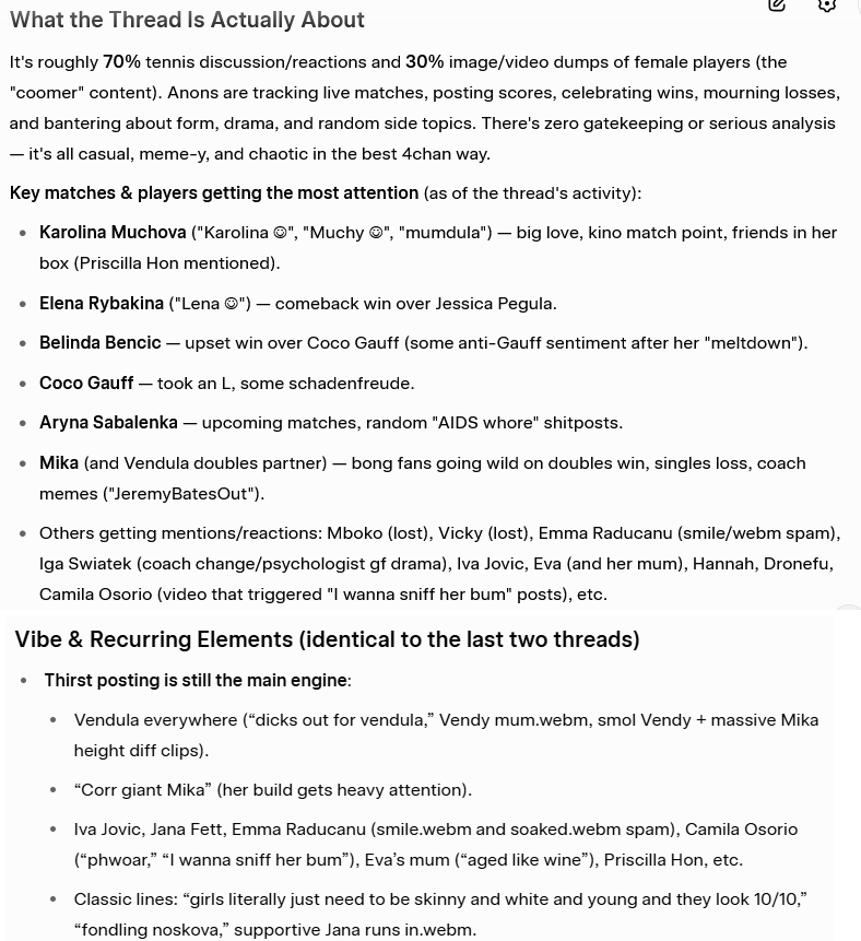 >Overall, the posters lead fairly ordinary, often solitary lives outside the thread—wage work, school, occasional social setbacks—but their primary social and emotional engagement appears to happen inside the /tennis/ board. The thread functions as a third place where they can merge a niche sports interest with the anonymity, in‑jokes, and ritualized objectification that 4chan culture provides. For many, it likely represents a central part of their leisure identity, filling time that might otherwise go to other forms of social interaction.