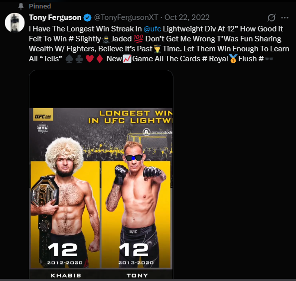 >>154017352Just a theory but i think the real reason for Tony's decline is his motivation for fighting going down to nothing after the final Khabib fell through, he still has this 2022 tweet pinned on his twitter, Izzy is kinda similar in that regards for when he finally beat Pereira and just kept going for the paycheck, he declined, i hope he can still pull through one more time and possibly fight for the title next
