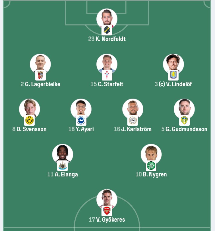 >Swedish starting XI already leakedMålvakt: Kristoffer Nordfeldt.Försvarare: Daniel Svensson, Gustaf Lagerbielke, Carl Starfelt, Victor Nilsson Lindelöf och Gabriel Gudmundsson.Mittfältare: Yasin Ayari och Jesper Karlström.Anfallare: Anthony Elanga, Viktor Gyökeres och Benjamin Nygren.