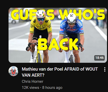 >Tragedy for Van Aert. It's almost a tragedy for Van Aert in this race. Two years ago he had six months ruined by a nasty crash, last year he suffered his most embarrassing defeat to Powless, and now he is picked up a few meters from the line. What should have been a great victory now ended with another one of his numerous 2nd places, of which he has so many. And he was also picked up just before the line on Sunday! Poor man!