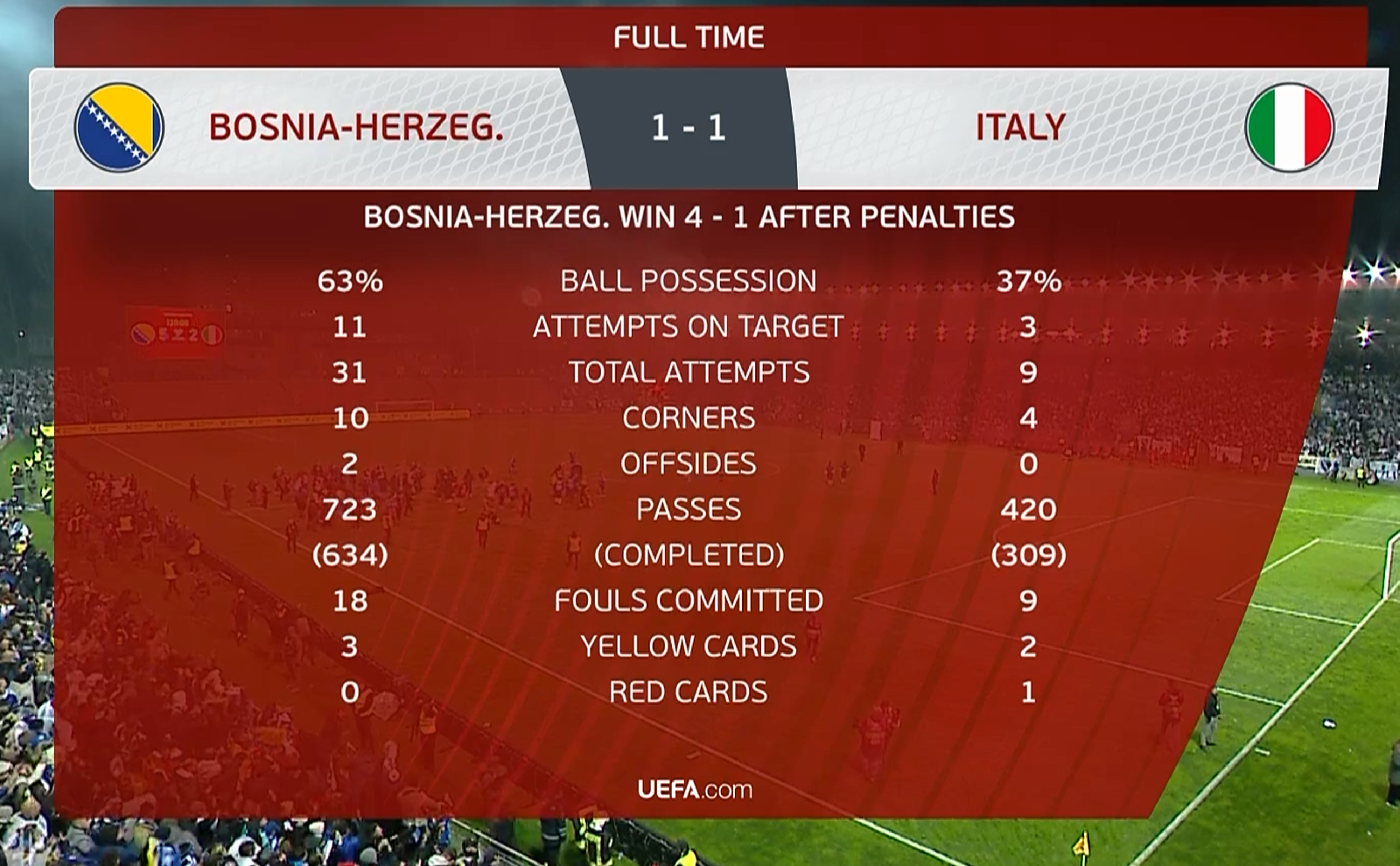 Italy brings it all down on itself again.No tactical plan whatsoever, a lucky goal, a ridiculously stupid red card, and then nothing but dropping back.After halftime, just 23% (!!!) possession against BOSNIA and now the 1-1 against.More traumas than your average catholic church choir.
