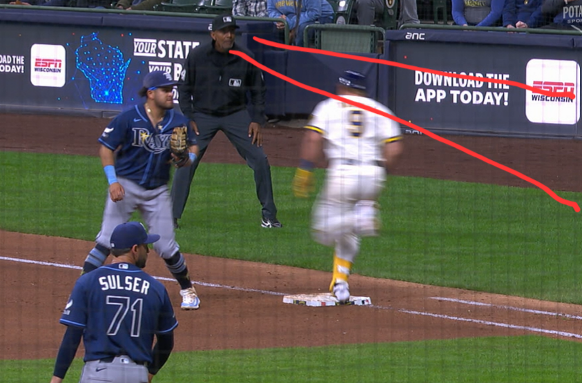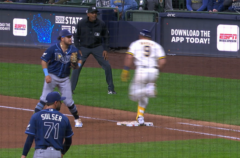 >First base umpire CB Bucknor ruled Jake Bauers did not step on first base and was out. >Here are two stills of him stepping on the middle of the base. The call was promptly overturned.