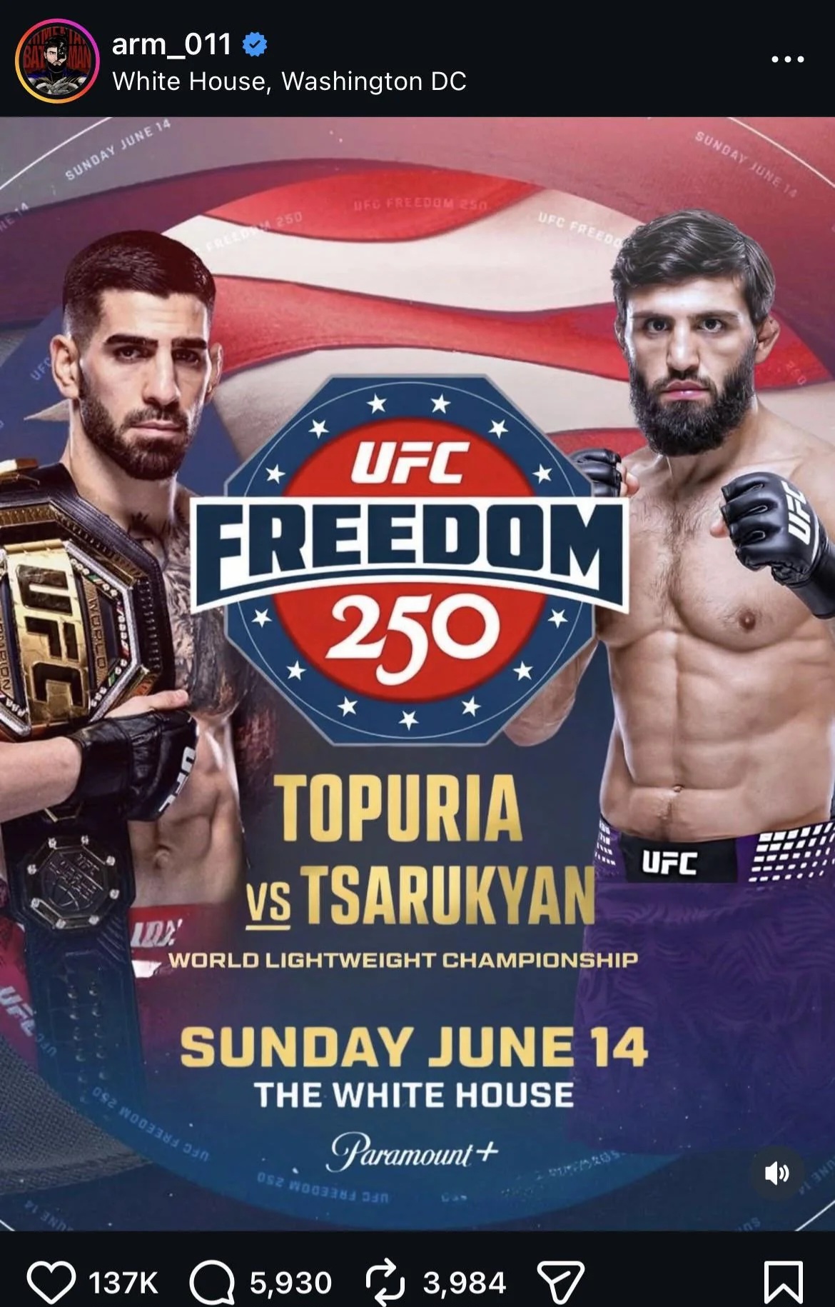 Justin pulled out due to injury.Ilia vs Arman at the white house is official.
