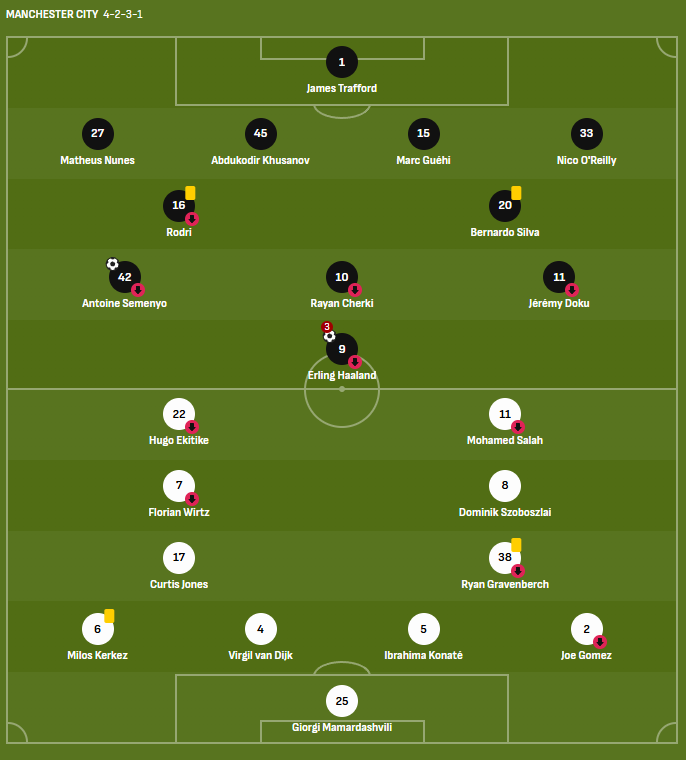 Man City: Trafford, Nunes, Khusanov, Guéhi, O’Reilly, Rodri, Silva, Semenyo, Cherki, Doku, Haaland.