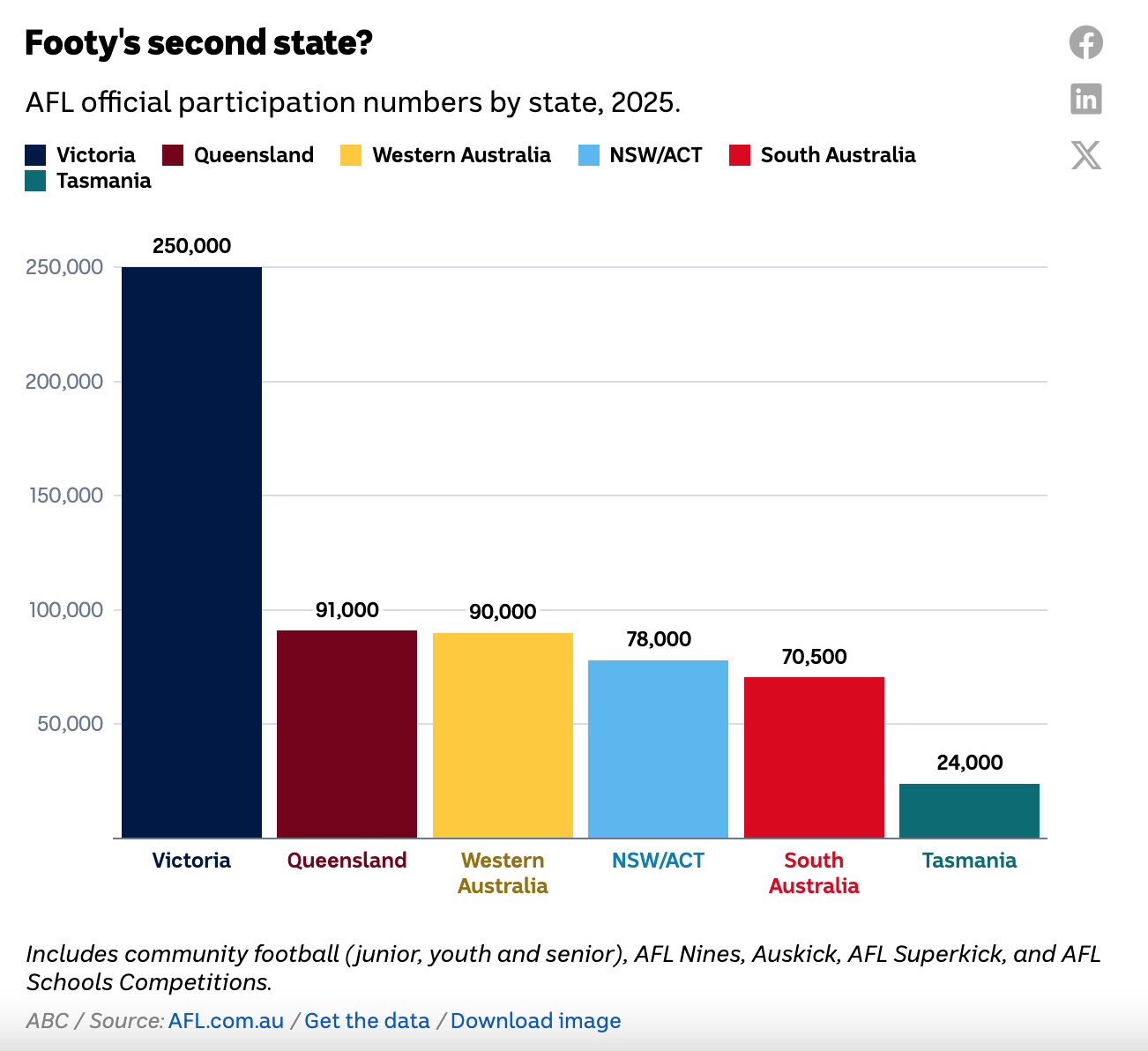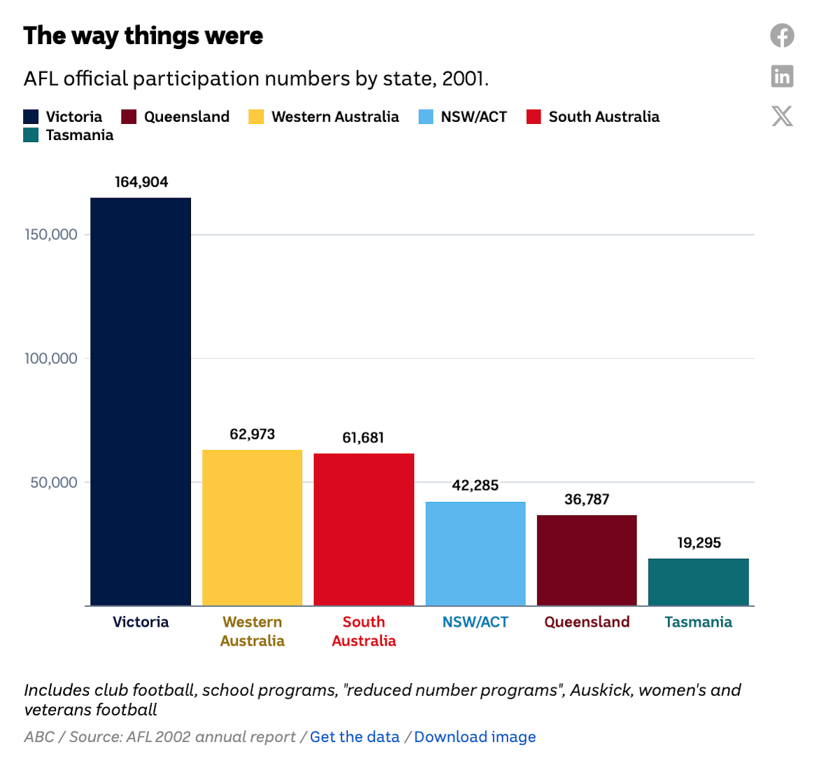 Might as well stick this post here. Didn't realise the other thread was about to die.>>154109535I think the AFL loves being able to take away market share in NRL heartland territory but it's bigger than that. Look at how divided the competition is now in terms of good and poor teams and we're about to add a 19th team within two years and then likely a 20th within a decade. The talent pool needs to grow. Badly. Until recently QLD and NSW were contributing fuck all to the talent pool. That's finally starting to change and QLD now the second largest state for participation. Can't have the 1st and 3rd most populous states putting nothing into the pool. I really don't think the AFL has done enough to grow it at grassroots in those two states but they're no doubt happy that the teams are doing well and helping it grow.