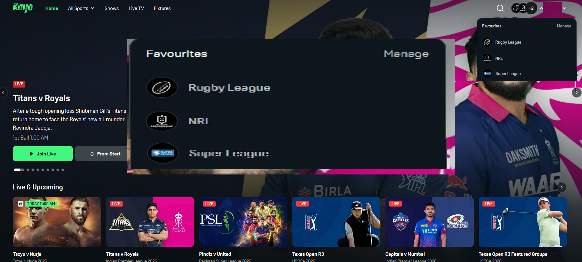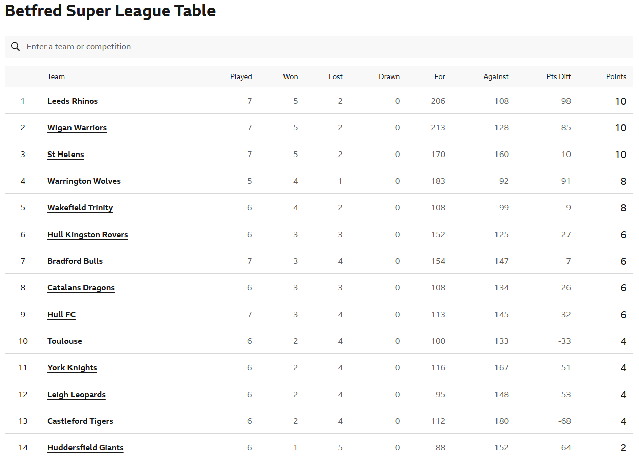 >>154110418SUPER LEAGUE>GAME 1Warrington Wolves v Leigh Leopards01:00am AEDST on Fox and Kayo1.28-3.60>Round 7 of the Super League from Halliwell Jones Stadium>GAME 2Huddersfield Giants v York Knights01:00am AEDST on Fox and Kayo1.34-3.30>Round 7 of the Super League from The Accu Stadium>GAME 3Catalans Dragons v Toulouse Olympique XIII 03:00am AEST on Fox and Kayo1.19-4.60>Round 7 of the Super League from Stade Gilbert Brutus>GAME 4Castleford Tigers v Wakefield Trinity00:00am (Monday) AEST on Fox and Kayo2.45-1.59>Round 7 of the Super League from The OneBore Stadium