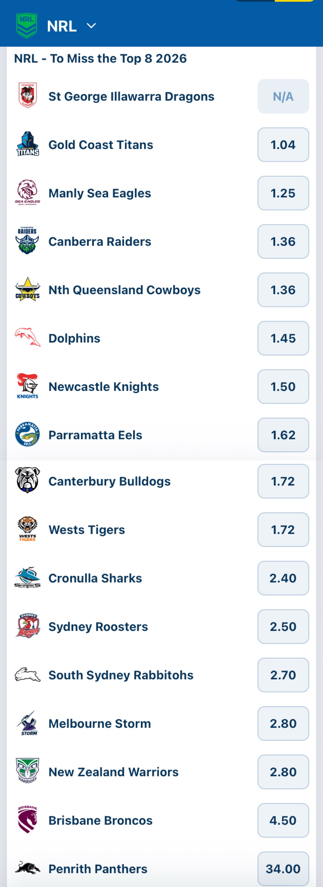>>154115983Broncos - yesBulldogs - yes but they only post when they winCowboys - yesDolphins - probablyDragons - yes Eels - yesKnights - yesPanthers - noRabbitohs - yesRaiders - probably Roosters - yes but they only post when they winSea-Eagles - yesSharks - probablyStorm - noTigers - yesTitans - possibly Warriors - yes