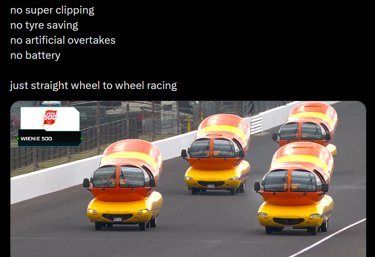 >>154123666Wow I can't believe that other series now have better racing behind their SC than 2026 F1.