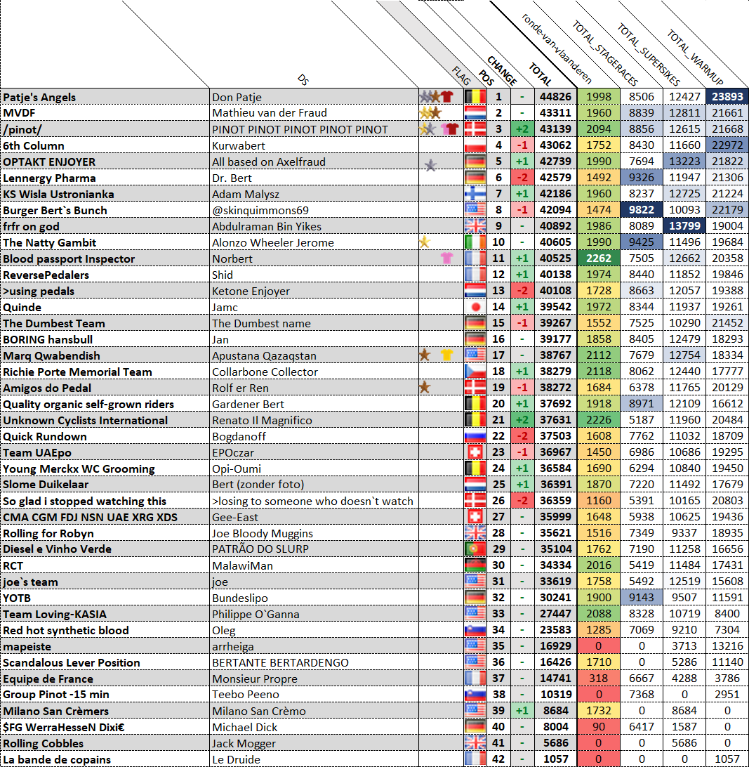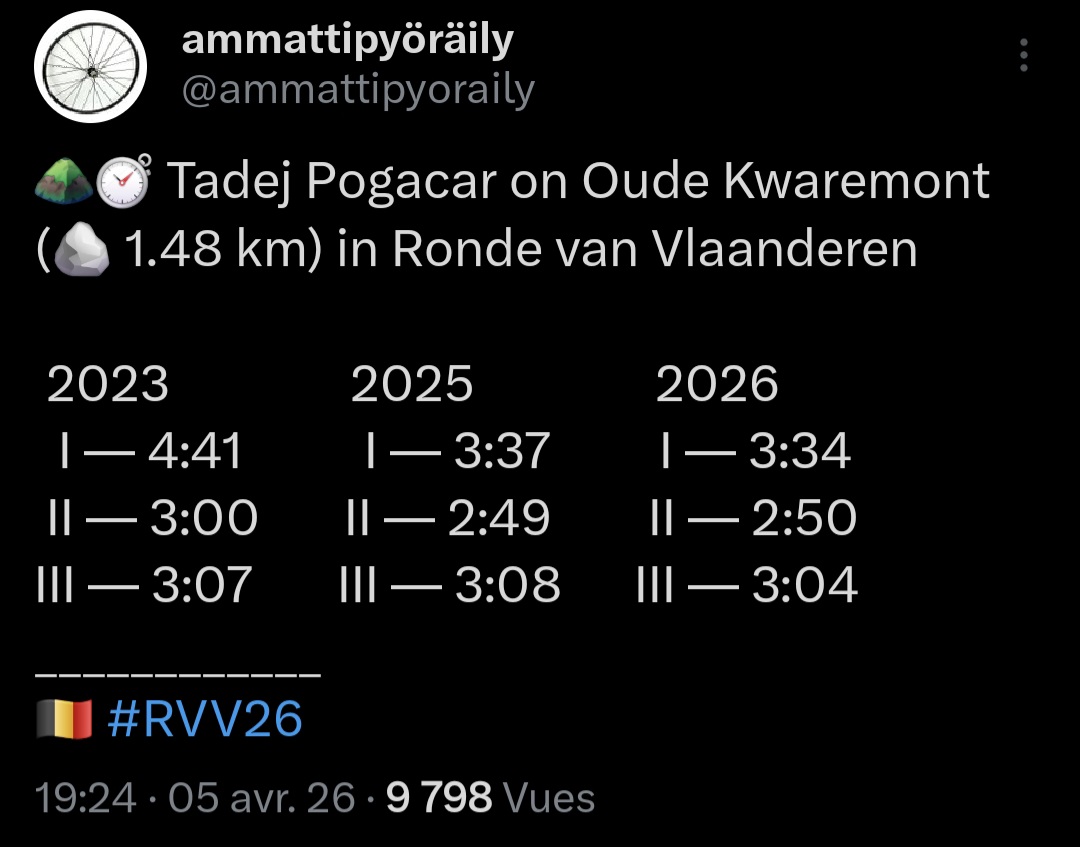 moral winners edition >Current and upcoming road races06.04 Ronde de Mouscron 1.1 WE 06.04 - 11.04 Itzulia Basque Country 2.UWT07.04 - 10.04 Région Pays de la Loire Tour 2.Pro08.04 Région Pays de la Loire Tour - Féminin 1.1 WE08.04 Scheldeprijs vrouwen elite 1.Pro WE08.04 Scheldeprijs 1.Pro12.04 Paris-Roubaix Femmes Hauts-de-France 1.WWT12.04 Paris-Roubaix Hauts-de-France 1.UWT14.04 - 18.04 O Gran Camiño - The Historical Route 2.115.04 Ronde van Limburg 1.115.04 - 19.04 Tour of Hainan 2.Pro17.04 Classic Grand Besançon Doubs 1.117.04 De Brabantse Pijl - La Flèche Brabançonne WE 1.Pro17.04 De Brabantse Pijl - La Flèche Brabançonne ME 1.Pro18.04 Tour du Jura Cycliste 1.119.04 Amstel Gold Race 1.UWT19.04 Amstel Gold Race Ladies Edition 1.WWT 19.04 Grand Prix Féminin de Chambéry 1.1 19.04 Gran Premio Ciudad de Eibar 1.1 WE 20.04 - 24.04 Tour of the Alps 2.Pro 22.04 La Flèche Wallonne 1.UWT22.04 La Flèche Wallonne Femmes 1.WWT 23.04 - 26.04 Vuelta Asturias Julio Alvarez Mendo 2.125.04 EPZ Omloop van Borsele Women 1.1 WE25.04 Gran Premio Della Liberazione Donne 1.1 WE26.04 Liège-Bastogne-Liège Femmes 1.WWT26.04 Liège-Bastogne-Liège 1.UWT26.04 Giro dell'Appennino 1.126.04 - 03.05 Presidential Cycling Tour of Turkiye 2.Pro28.04 - 03.05 Tour de Romandie 2.UWT>Mecha-Rusbert's webm folders:https://pastebin.com/Mx1GyU53 >Bert van Koers' ciclismo quizzes:https://www.sporcle.com/user/Bert_van_Koers/quizzes/>Races info:https://www.procyclingstats.com/https://firstcycling.com/>Free streams:https://cyclingtiz.live/https://dlhd.dad/>Velodrama league code:51196855Previous thread:>>154085924