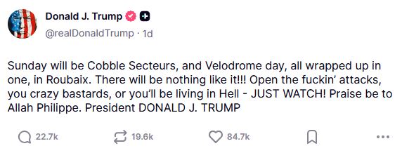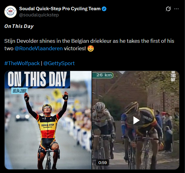 by winning the Tour of Flanders, he became the first cyclist to win four consecutive monuments. next week he has the opportunity to win the last major one-day race he still needsParis-Roubaix will be fucking WILD