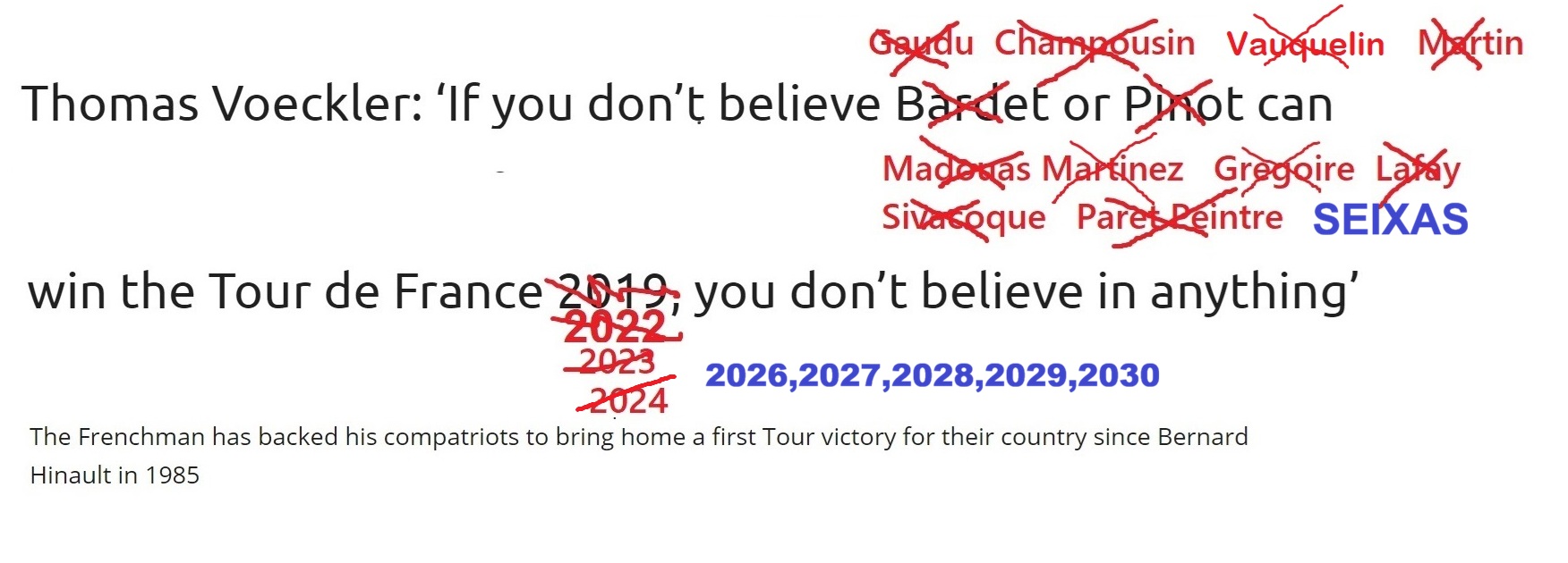 >>154133943The curse exists because French rider have been shit and/or weakminds since the 2000s. Seixas is the best French talent since Hinault