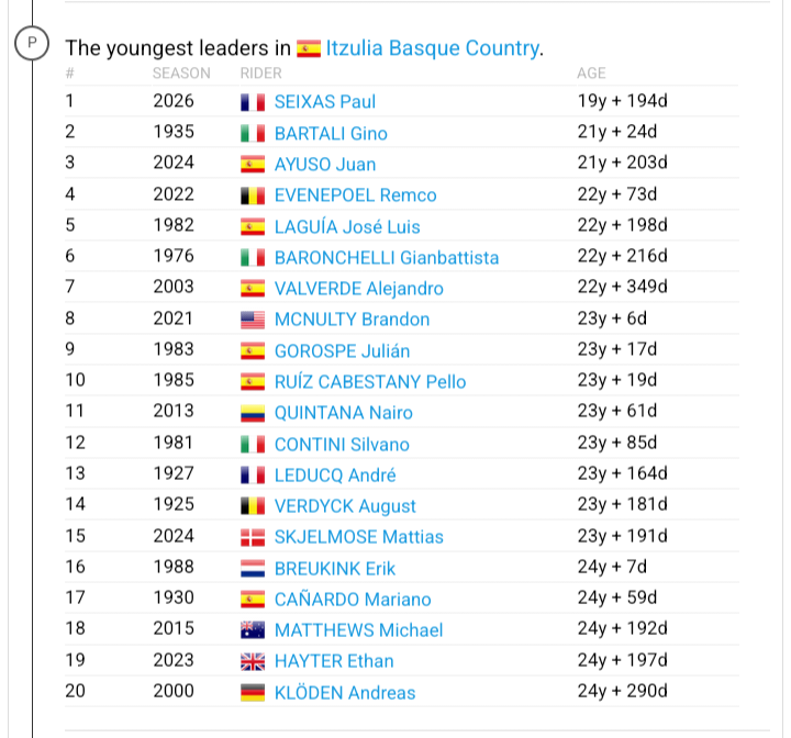 >>154134535He is the youngest stage winner, a year and half younger than Bartali was when he first won a Itzuila stage.https://www.procyclingstats.com/race/itzulia-basque-country/results/youngest-oldest-stage-winners