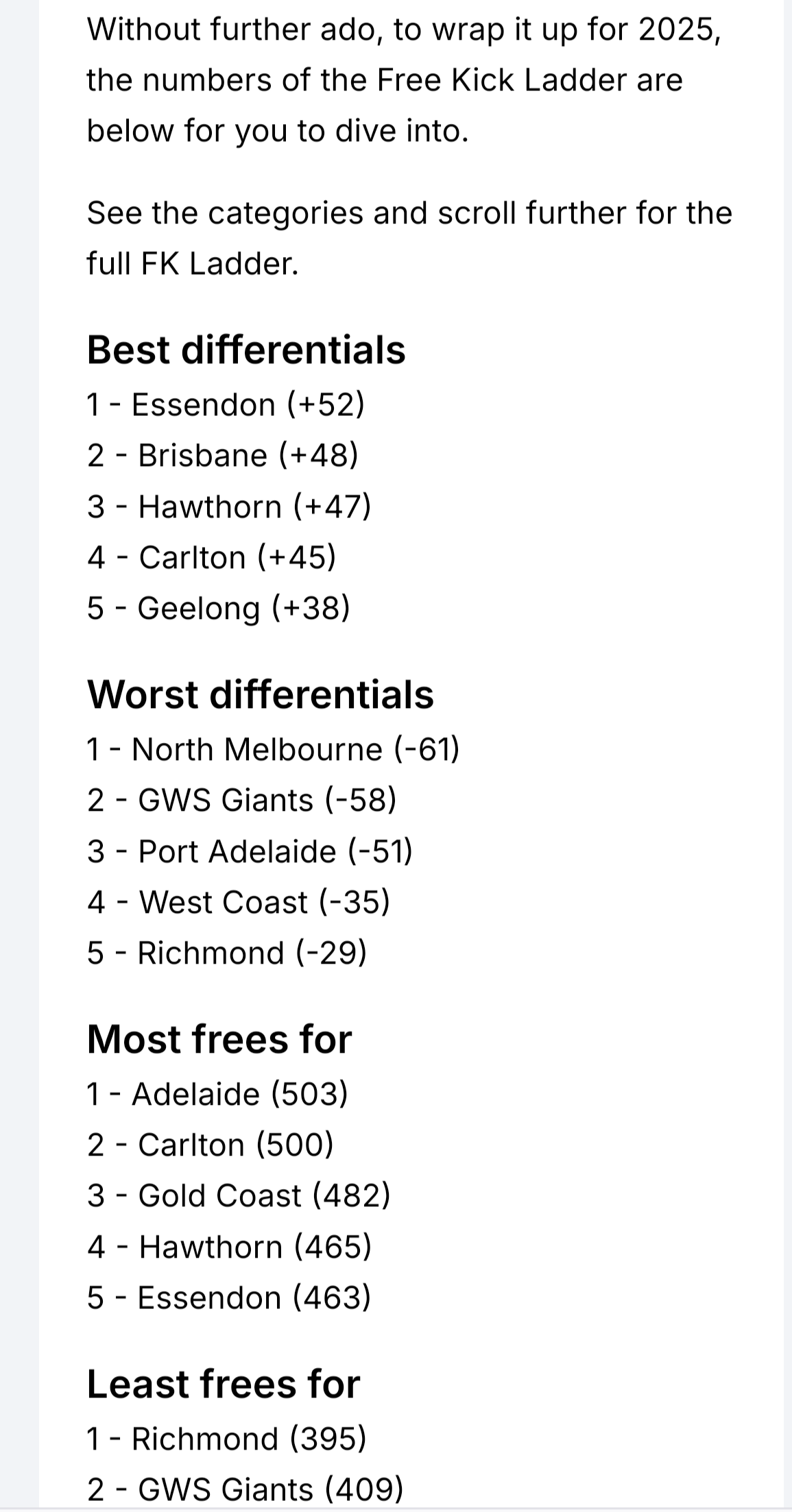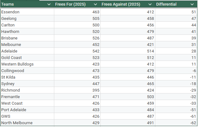 >>154147383Whoever did those numbers made a few mistakes.For some reason all of their Frees Against are off by oneThese are the raw numbers taken from the AFL's website, which also includes finals