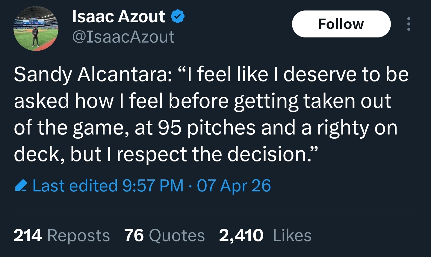 >>154149815soler got hit by a pitch earlier apparently, probably related to that