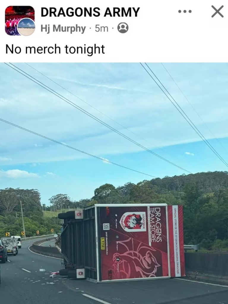 >Dragons merchandise truck crashes on highway ahead of Wollongong game>Talk about bad omens. As the Dragons fight for their first win of the season, their merchandise truck has crashed during the drive to their home base Wollongong.KEK