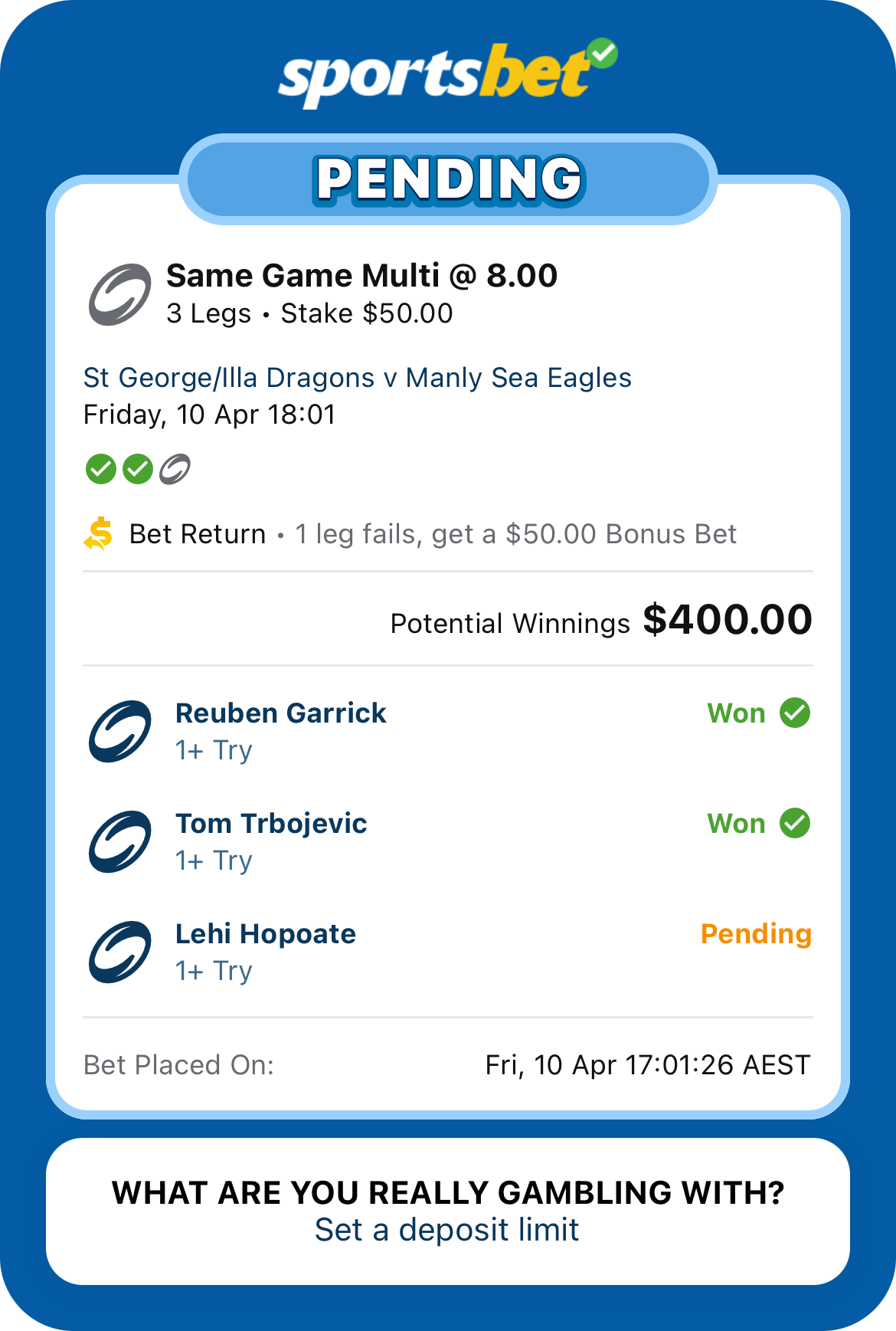 No answers editionNRL>GAME 1St George-Illawarra Dragons v Manly Sea-Eagles6:00pm AEST on Fox and KayoWIN Stadium2.90-1.41>WIN Stadium will host a Friday evening clash that finds two traditional rivals at opposite ends of the momentum spectrum, with the winless Dragons desperate for a breakthrough against Manly. The Dragons are enduring a nightmare start, underscored by a 0-32 loss to the Cowboys last week.The Sea Eagles revived their season in Round 5 with a 52-18 demolition of the Dolphins under the guidance of temporary coach Kieran Foran. Manly has won 2 of the last 3 matches against the Dragons, including a 40-24 win in Round 27 last year. but have only won one of the last ten games at WIN StadiumDragons 1-12 3.80Dragons 13+ 7.50Sea-Eagles 1-12 3.00Sea-Eagles 13+ 2.35Dragons +7.5 1.98 Sea-Eagles -7.5 1.83>GAME 2Brisbane Broncos v North Queensland Cowboys8:00pm AEST on Fox, Kayo and Ch9Suncorp Stadium1.86-1.98>Suncorp Stadium will be centre stage on Friday night, with both the Broncos and Cowboys sitting on 3-2 records and looking to cement their place in the top eight. The Brisbane Broncos secured a gritty 12-26 victory over the Titans last week, marking their third consecutive win after a slow start. The North Queensland Cowboys are also on an upward trajectory following a 32-0 demolition of the Dragons in Round 5. The Broncos are forced to replace Reece Walsh, with Jesse Arthars moving to the No.1 jersey for his 100th NRL game. The Broncos have won the last six H2H encounters, including a high-scoring 38-30 victory in Round 26 last season. Historically, the Broncos have won 39 out of 60 meetings with the Cowboys. Broncos 1-12 3.10Broncos 13+ 3.80Cowboys 1-12 3.25Cowboys 13+ 4.00Broncos -1.5 1.97 Cowboys +1.5 1.85previous thread >>154152282