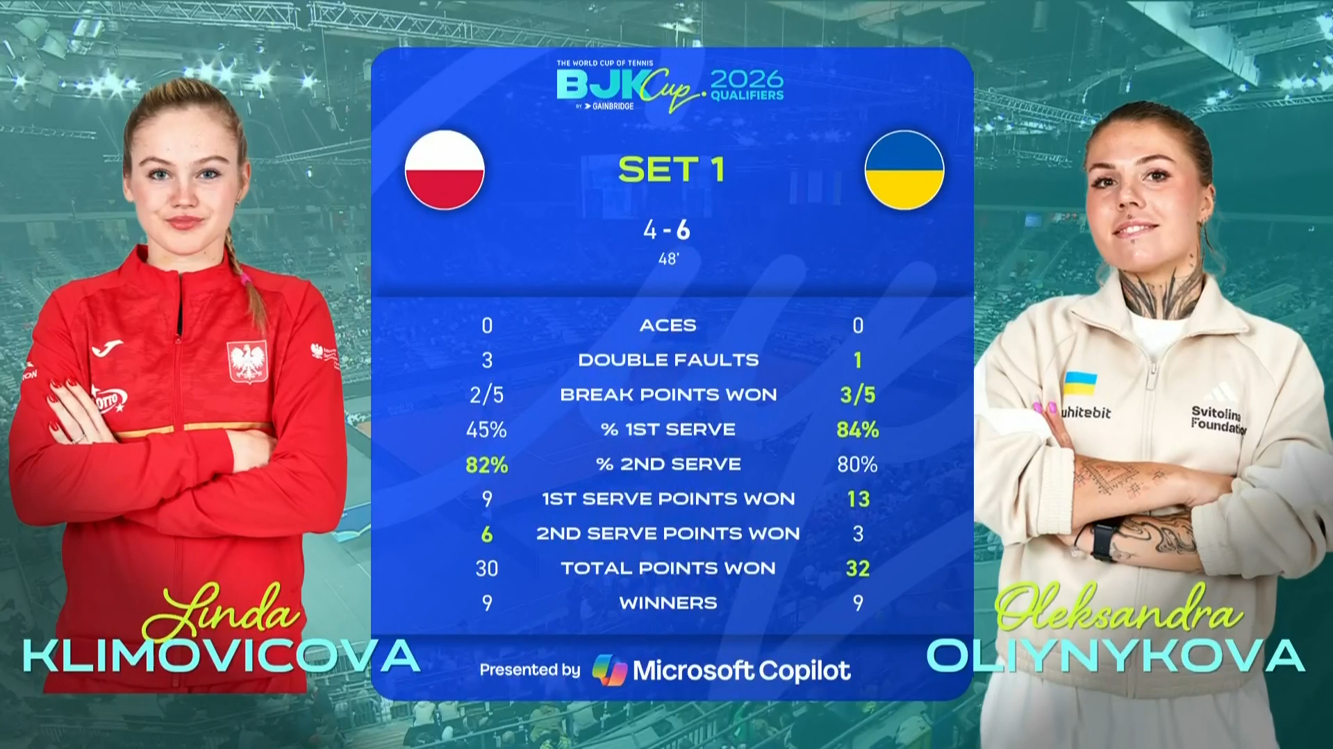 mapta makes it 1-0 Ukraine with a second set bagel over linette