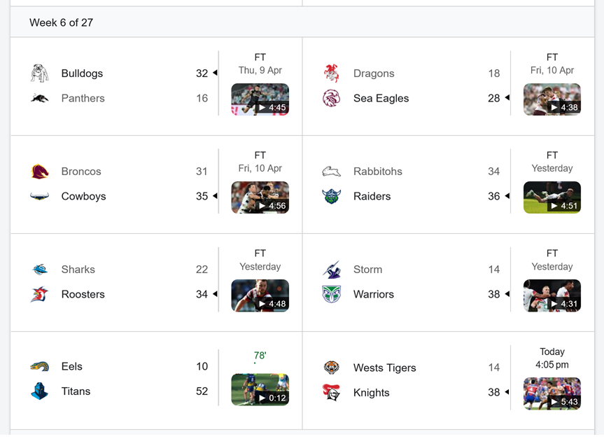 Welcome to the jungle editionNRL>GAME 1Parramatta Eels v Gold Coast Titans2:00pm AEST on Fox and KayoCommBank Stadium 1.68-2.18>CommBank Stadium will be the venue for a Sunday afternoon clash between two clubs decimated by injuries and poor consistency. The Eels are coming off a heart-breaking 20-22 loss to the Tigers on Easter Monday. The Titans are struggling for rhythm, having lost 12-26 to the Broncos last week. Historically, this is a close H2H with 14 wins for the Eels and 13 for the Titans in 27 meetings. Parramatta won their most recent clash 36-20 in June last year. Eels 1-12 3.10Eels 13+ 3.10Titans 1-12 3.45Titans 13+ 4.90Eels -2.5 1.90 Titans +2.5 1.90>GAME 2Wests Tigers v Newcastle Knights4:05pm AEST on Fox, Kayo and Ch 9Campbelltown Sports Stadium1.66-2.23>Round 6 concludes with a shock top-four battle at Campbelltown Sports Stadium, as the Tigers host the Knights. The Wests Tigers are the surprise story of 2026, cemented by a 22-20 win over the Eels on Easter Monday. The Newcastle Knights are enjoying their best start in years after a professional 32-12 victory over the Raiders. Fletcher Sharpe boasts six tries in three outings versus the Wests Tigers. The Knights have won seven of their last eight meetings with the Wests Tigers, who are on a five-game losing streak at Campbelltown Sports Stadium.Tigers 1-12 3.10Tigers 13+ 3.05Knights 1-12 3.40Knights 13+ 5.10Tigers -3.5 1.89 Knights +3.5 1.91previous thread >>154172267