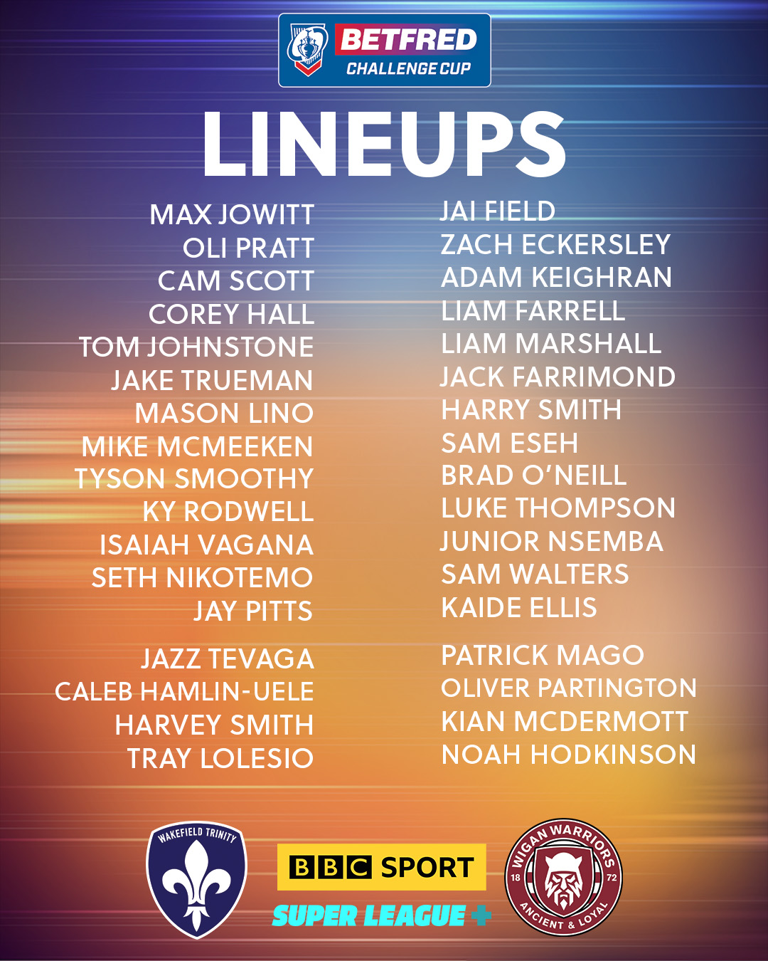 >>154183566CHALLENGE CUP>IN PROGRESSHull KR v York Knights Currently on Fox and Kayo>Quarter Final of the Challenge Cup from Craven Park>GAME 0Warrington Wolves v Leigh Leopards02:30am AEST 1.22-3.60>it’s not on tv here for some reason>GAME 1Wakefield Trinity v Wigan Warriors 10:00pm AEST on Fox and Kayo2.70-1.40>Quarter Final of the Challenge Cup from DIY Kitchens Stadium