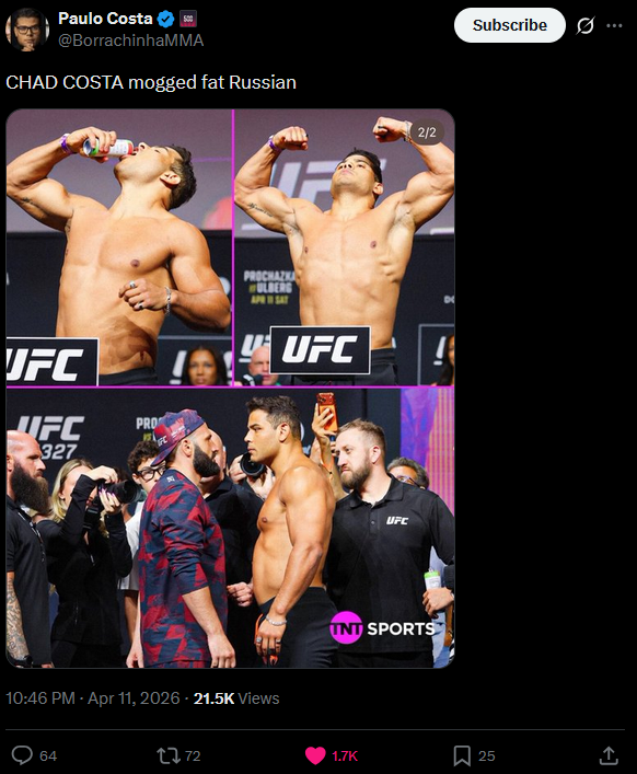 >>154200029>Paulo Costa vs Khamzat Chimaev for the vacant Light Heavyweight TitleChills...