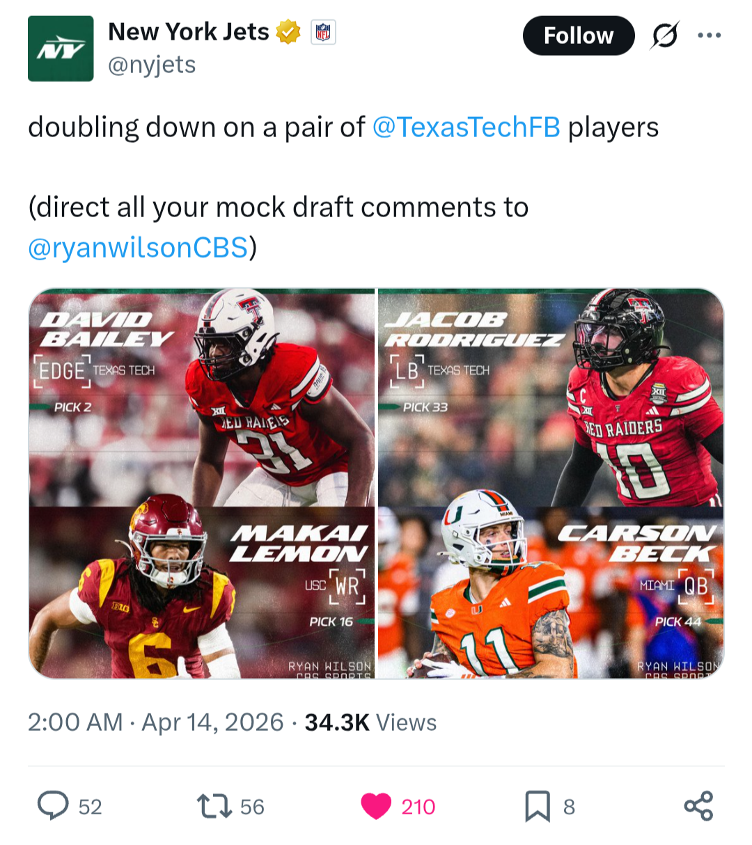 >>154212541Doubtful. I feel like we'll go playmaker at 14 whether it's WR or TE then DL/pass rusher in the 2nd. I'm usually pretty good at having a feel for what positions we're gonna target