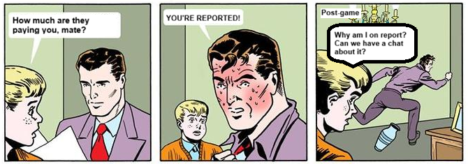 >>154213434>>154213501According to Butters he just asked why it was a free kick. Which TECHNICALLY is meant to be a 50m penalty, youre not supposed to question or cause dissent. And umps seem to have stopped paying those after being hot on it a few years ago. But is it worthy of being reported? Probably not.Always makes me laugh how soccer is a poof faggot game yet they regularly surround their ref's, yell and scream and question their decisions and the ref's just tell them to piss off and go away and thats that. Our yellow maggots are so full of themselves its crazy.
