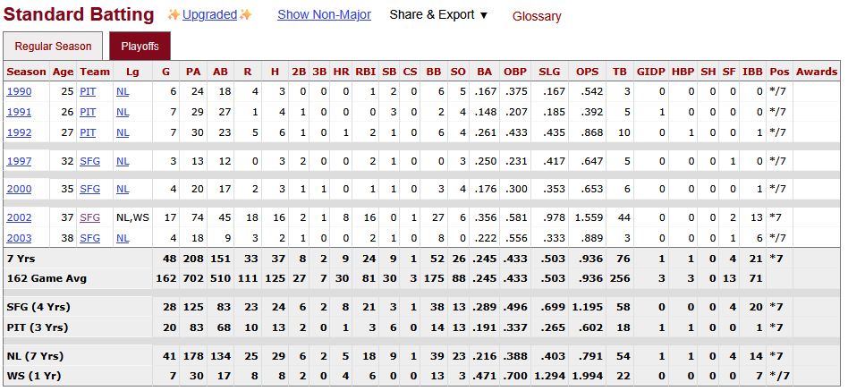 >>154218289he was good in 1992 and 2003. overall a .936 OPS is very good. he played a lot of his career without the wild card though and SF was often a 2nd or 3rd place team.