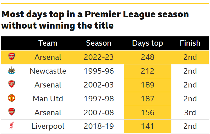 >>154222835That's Liverpool. The third-highest point tally ever in the Premier League is City's 98 points from 2018/19. They obviously won the championship. Liverpool that season got the fourth-highest point tally ever - 97Arsenal's record point tally is 90, they won the league that year. They finished second with 89 in 23/24, City had 91 pointsArsenal hold the record for "longest time spent in 1st place without winning the title", something in the 90% range. They are second as well, I believe. Probably have another Top 5 season as well in that regard