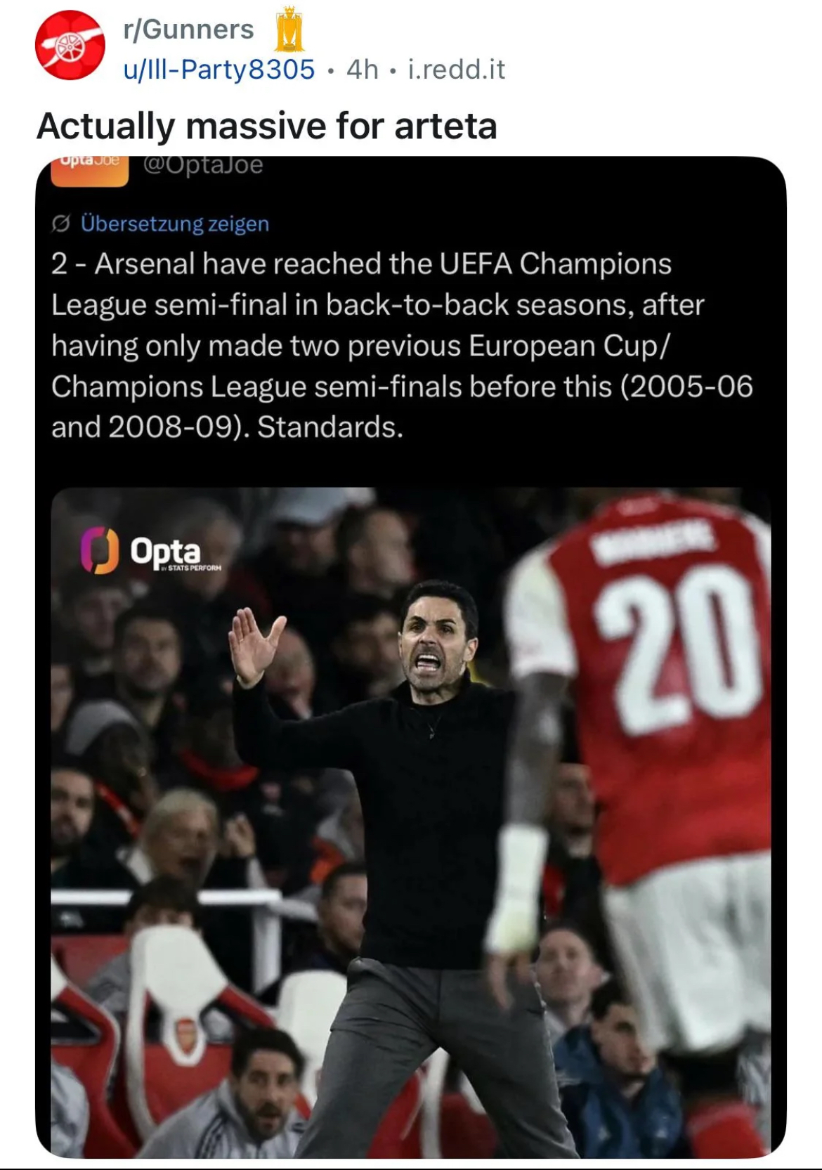 >>154245417We ABSOLUTELY cannot blame external factors anymore, it's a complete rubbish of an excuse.How many external factors are there? This is his SEVENTH season at the club, he delivered ONE fa CUP, and CHOCKED the league fucken 4 times(? I cant even keep count anymore thats how messed up this is) the external factor might have happened once; perhaps we're unlucky and it occured twice, but ALL THIS?no way, in quite simple mathmatix, there's only ONE constant in the football club, everything around him from players to fans to assisstants to chiefs to medical departments to the members of the board are all shifting, but he's the only constant in this equation that remained unchanged, how can you interpret this in any other way?The only remaining constant needs to be replaced to have a different outcome for the equation, otherwise this is all futile.>>154245497We're objectively NOT a bad counter attacking team; nor is it not a part of "arteta's system"(whatever it may be), the sole reason we employ martinelli(whos basically legally blind) is to help the defensive fuck ups and to catch opponents off guard on the counter( which occured multiple times).And our possession style is a complete mystery that even arteta himself doesn't know when will it work and when will it not, this becomes evident when we play even slightly compotent opponents(aka manchester city& liverpool) who just simply take the ball away and don't fall for our pass the ball to raya then hoof it in the middle of the pitch.>press high when out of possession and defend deep when press doesn't workWhat else do you think we can do? What other option is there?"The style is we do A, and if A doesn't work we do B, and if B doesn't work we do C" That's not a playstyle, that's just getting swept away wherever the wind blows.