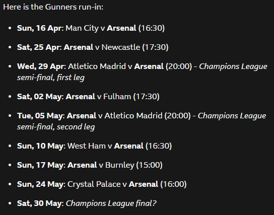 I remember a month or two ago where we were making scores and it turned out arsenal could afford 2 losses and a couple draws whilst city had a pretty good run to the line. It's definitely not over. But after the city game they cannot lose. Their loss quota runs out after city. Play the u14s, rest arteta. After that, there's zero excuses.