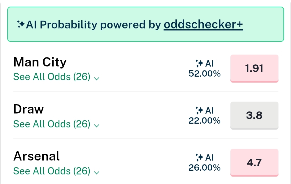 >>154245055Ai is never wrong.Still basically a 'double your money' shot, but I expect that to get less generous between now and kick off. For Arse fans, it's a no-brainer, a small consolation for their (inevitable) upcoming FUCKING TROUNCING BY CITEEE OH YESSSsss..