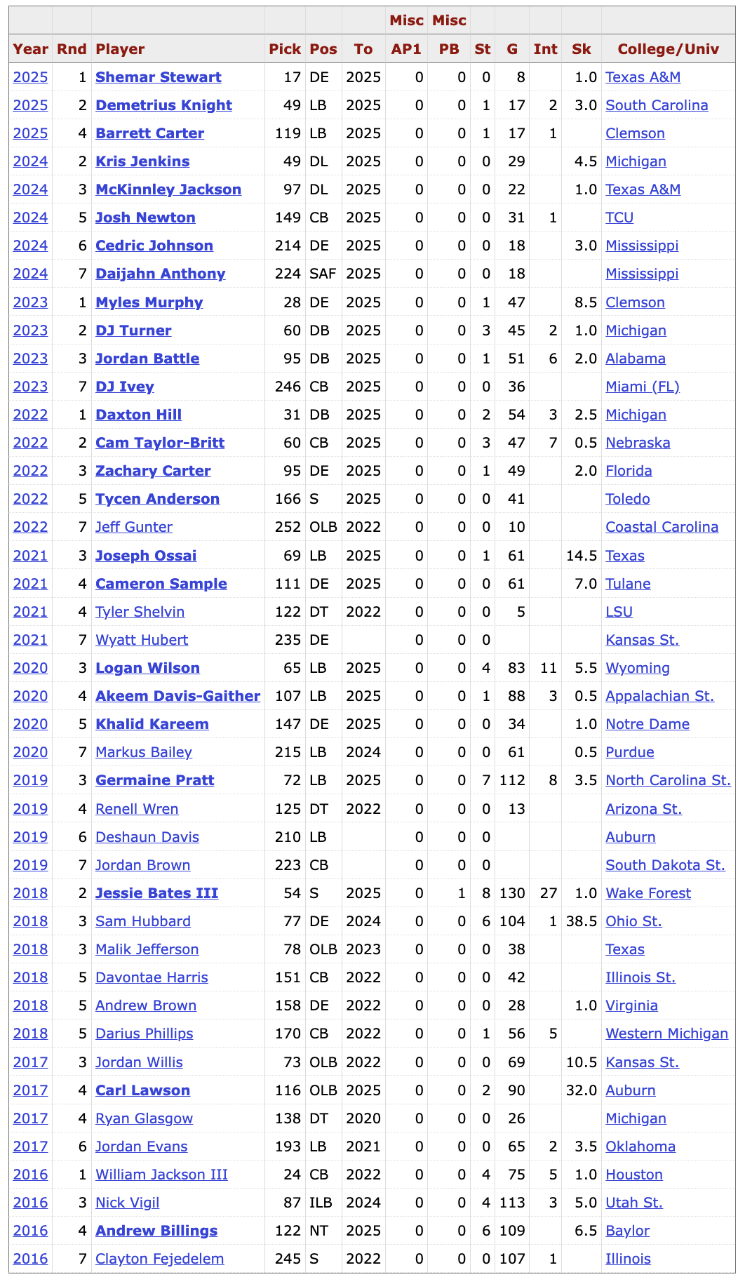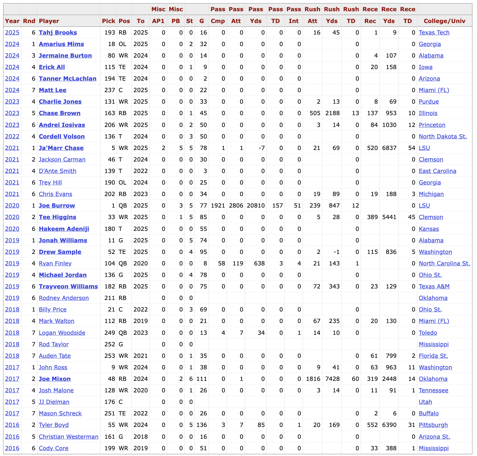 >>154280658They get zero credit for drafting Joe Burrow and Jamar Chase. Both guys were impossible to miss prospects taken with top 5 picks. Higgins they deserve credit that was a nice hit. The most successful teams in the league are the ones who hit on starters round 3-5 which the Bengals have failed to do. I don't know what changed but they used to absolutely cook 2010-2015 I would find myself constantly getting pissed because they'd take players i wanted for the Ravens. Somethings definitely changed with their draft strategy since then