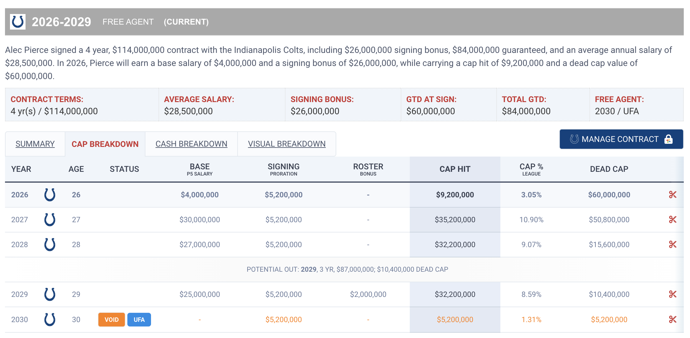 >>154280508He's mildly underpaid in 2026 (27th highest cap hit among WRs), and then very much overpaid in '27 (4th), '28 (10th), and '29 (5th).
