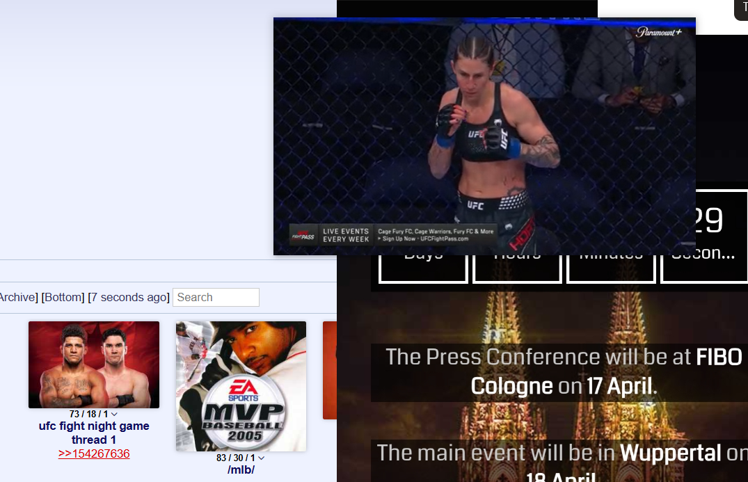 I made a javascript code with Gemini to watch the fights in Picture in Picture mode on ParamountJust bookmark this:javascript:(function(){function forcePiP(w){const v=w.document.querySelector('video');if(v){/*Remove travas de DRM e PiP*/v.disablePictureInPicture=false;v.removeAttribute('disablepictureinpicture');v.requestPictureInPicture().catch(e=>console.log('Tentando outro frame...'));return true;}for(let i=0;i<w.frames.length;i++){try{if(forcePiP(w.frames[i]))return true}catch(e){}}return false}if(!forcePiP(window)){alert('Vídeo não encontrado. Verifique se a luta já carregou.')}})();Then open the fight window and click on the bookmarked script