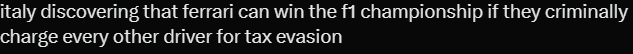>one of the drivers in the Italian moneygrab "investigation" is also being investigated for prostitution and drugs>most likely candidate is Hamilton>least likely candidate is also Hamilton