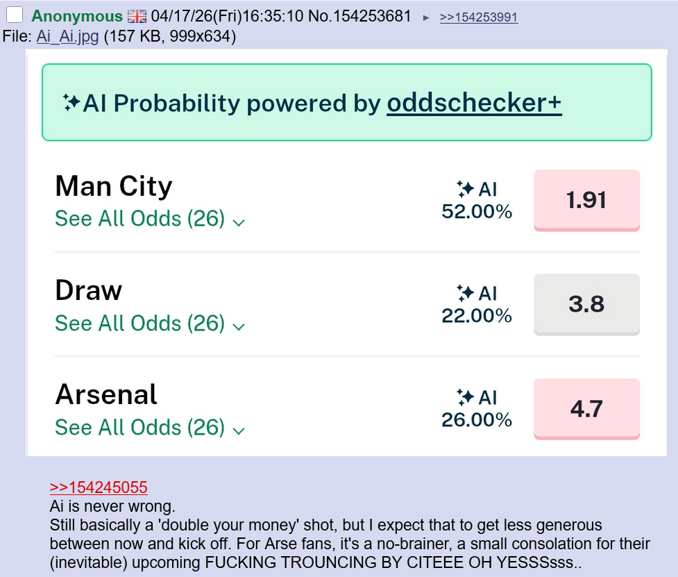 >>154290686>If City draw two of the remaining games they definitely won't win the league. I don't think anyone thinks any team can afford 2 draws at this point.The thing is there's this >>154290382Pep knows how to win at the end of the season, Arteta does not.