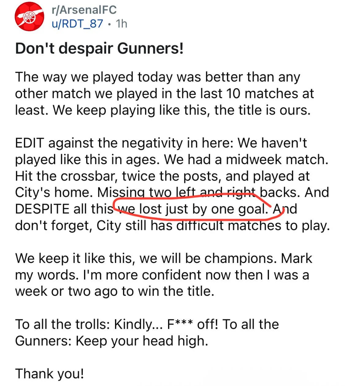 As they say, the hope is what really kills you. I already knew this result for weeks, so I'm not disappointed.I expected full on 0-0 terrorball plan into everything crumbling down, but the team actually tried to play out. If >we lost is because they were simply better, and to some degree you need to accept it, and it is better than losing due to full cowardice.Still Arteta OUT tho.