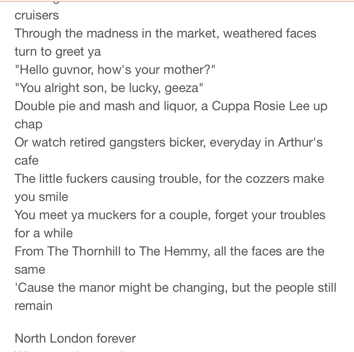 >>154306066>north london foreverWhat about the tottenham part lmao. The chorus is aight for a chant but the song is mega robbie williams boomer cringe