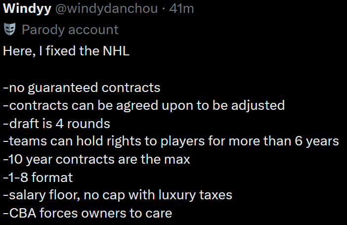 >Alex Tuch>Darren Raddysh>Rasmus Andersson>John Carlson>Charlie Coyle>Malkin>Jacob Trouba>Anthony Mantha>Bobby McMann>Jaden SchwartzHow can anyone look at this list of top UFAs and think their team is going to get better in the offseason? This is fucking bleak. Combine this with every player having full NMC/NTC and you can't even make trades. It's either tank for a decade or rot.