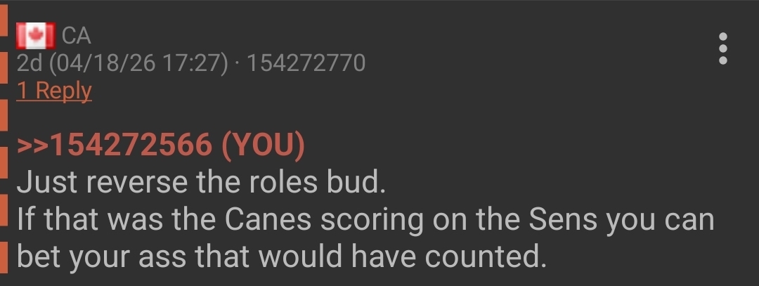 >>154306976game 1 of round 1 no less. must be someone from boston trying to infect the dabres with bad luck