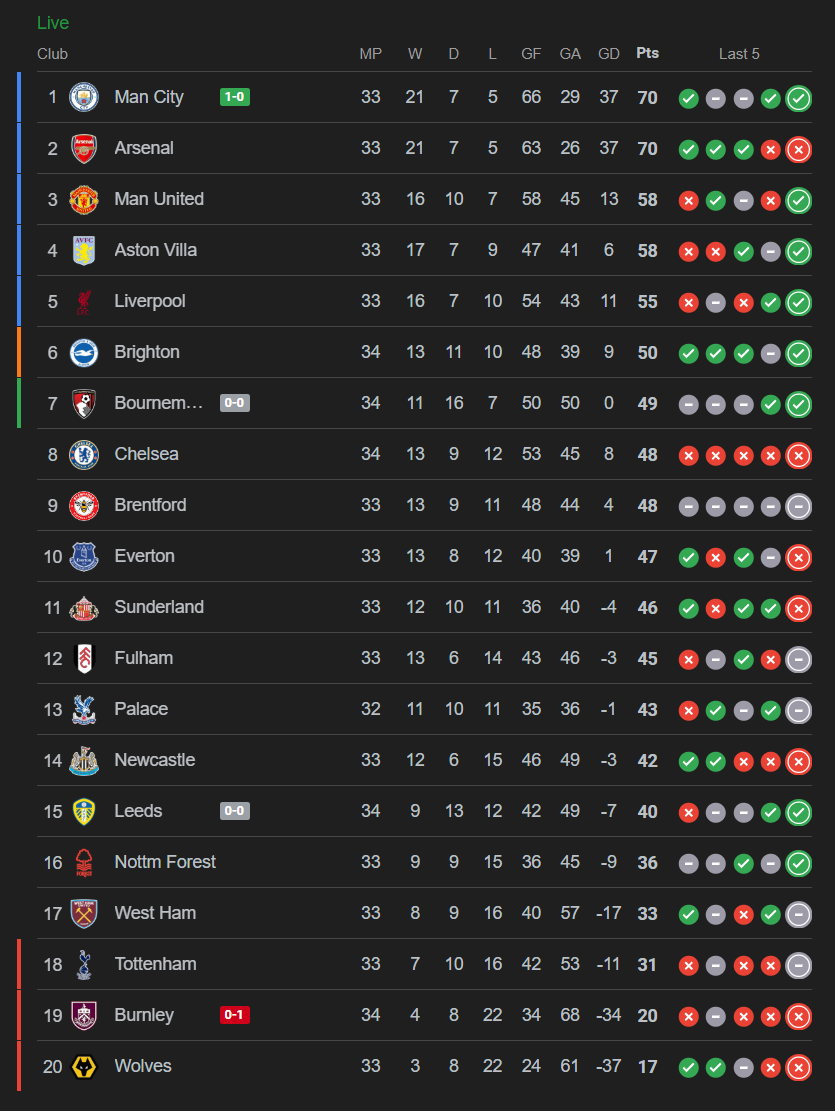 KO 20:00 UKBurnley relegated if they loseBurnley: Dubravka; Walker, Ekdal, Humphreys, Esteve, Hartman; Tchaouna, Ward-Prowse, Laurent, Anthony; Flemming. >Subs: Weiss, Worrall, Ugochukwu, Foster, Edwards, Luis, Pires, Broja, Tresor.Man City: Donnarumma; Nunes, Khusanov, Guehi, Ait-Nouri; Silva, O’Reilly; Semenyo, Cherki, Doku; Haaland. >Subs: Trafford, Reijnders, Stones, Ake, Marmoush, Kovacic, Gonzalez, Savinho, Foden.