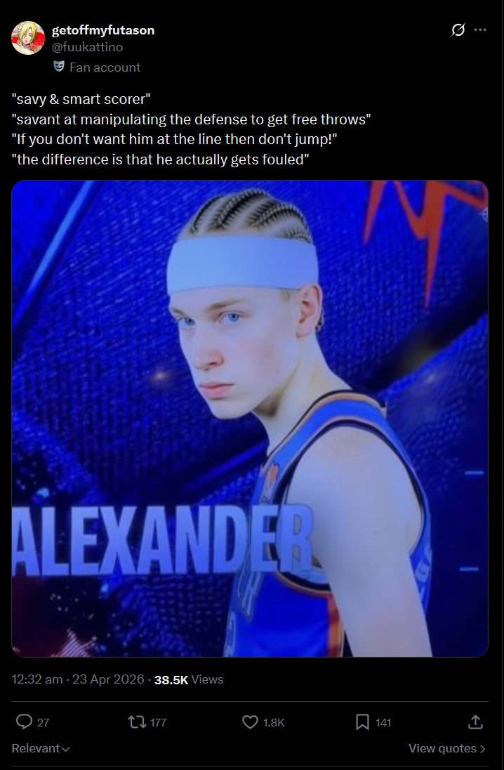 >>154338616>https://x.com/i/status/2047183650920264078Yeah he is. Fuck that faggot Shai. But no worries Snus fans. We the Lakers will make that bitch ass nigga cry. Luka Doncic owns SGA and is not even a debate.